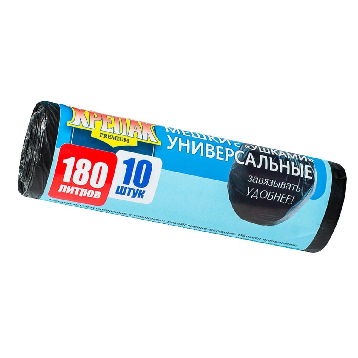 Мешки для мусора 180 л, с ушками, черные, в рулоне 10 шт., ПНД, 20 мкм, 1150х800 мм, Крепак, 4607075710498