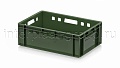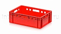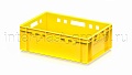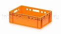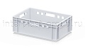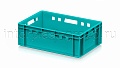 Ящик используется как контейнер универсальный и эффективный пищевой контейнер для различных категорий продукции. Он подходит как контейнер для продуктов, включая ящик для мяса серии Е и ящик для колбасных изделий. Стандартные габариты позволяют использовать изделие как евроконтейнер в единой системе с другими ящиками серии.