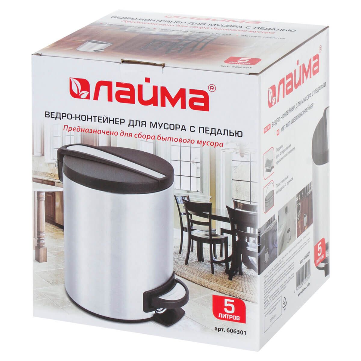 С вместительностью 5 литров, он идеально подходит для помещений с невысокой проходимостью. Педаль для открывания обеспечивает максимальное удобство использования, а плотно прилегающая крышка надёжно изолирует запахи. Съемное внутреннее пластиковое ведро с удобной ручкой для извлечения делает процесс утилизации максимально простым.